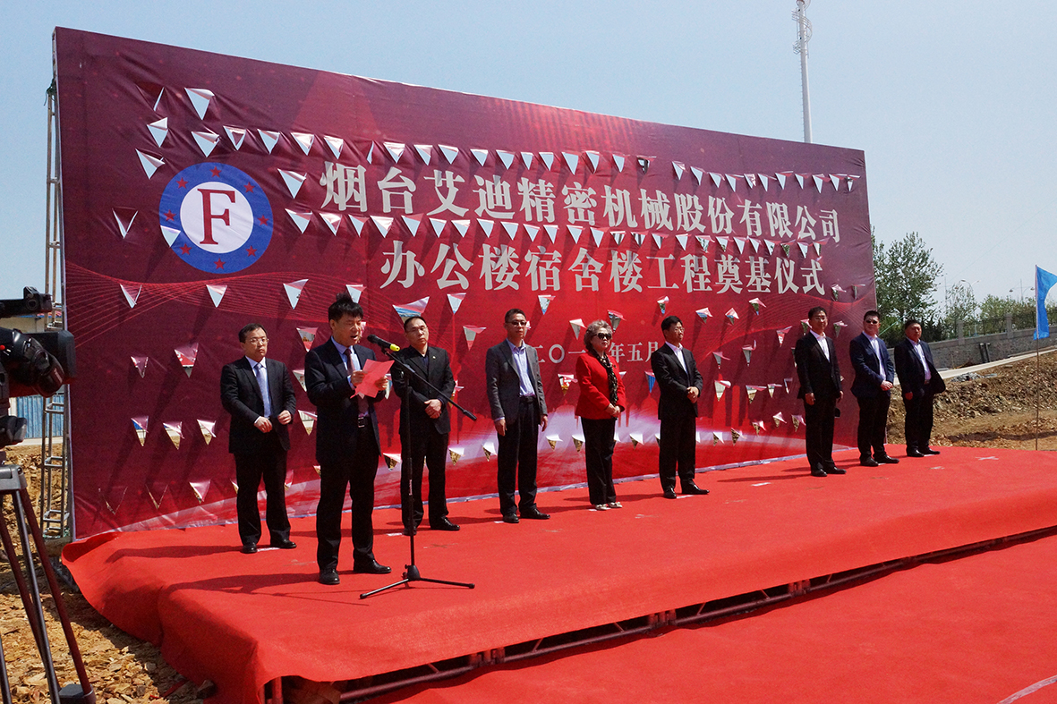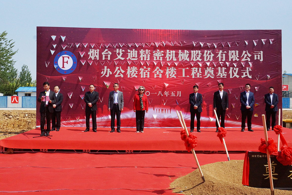 2018年5月4日上午10点,烟台艾迪精密机械股份有限公司办公楼、宿舍楼工程奠基仪式在工地现场隆重举行。参加此次庆典的有,烟台艾迪精密机械股份有限公司董事长宋飞先生、烟台飞龙集团有限公司董事长宋勇先生等公司领导及全体员工。